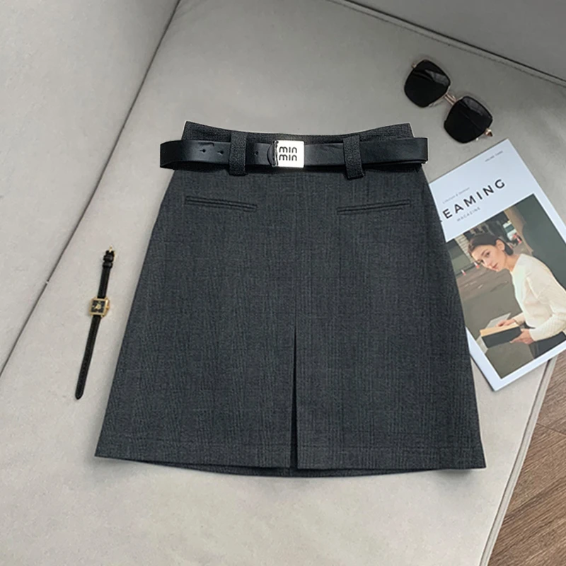【南油溪溪】灰色前开叉半身裙中裙秋冬格纹气质包臀A字裙802033